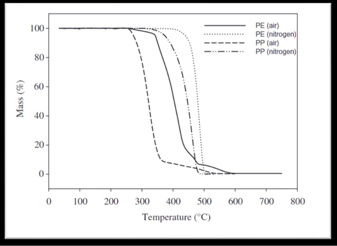 Abbil­dung 1: TG-Scans von PE und PP, gemessen bei konstanter Heiz­rate in zwei verschie­denen Test­um­ge­bungen: inerte Atmo­sphäre und Luft[12].